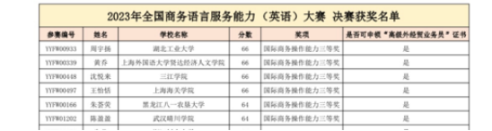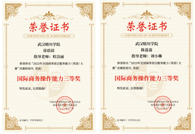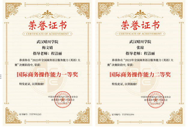 近日,2023年全国商务语言服务能力(英语)大赛决赛顺利落幕,我院学子梅文婧、张琼、徐晨晨、陈盈盈发挥出色,在决赛中荣获国际商务操作能力一等奖、二等奖、三等奖和三等奖,韦德体育bevictor程洁丽老师和刘小琳老师被授予“优秀指导教师”。
