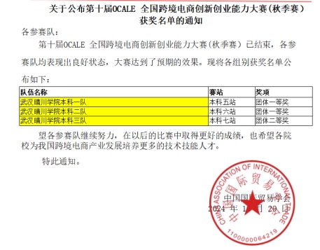 2024年11月26日至28日,来自全国28个省(市)、自治区的220所本科院校的1000余支队伍参加了第十届OCALE全国跨境电商创新创业能力大赛。我院商务英语专业学生团队凭借卓越的表现在比赛中再创佳绩。本科一队(杜乐、胡思珍、周欢、王德琳)和本科二队(梅文婧、王琼、周诗文、李燕)两队荣获本科组“团体一等奖”,本科三队(李舒窈、刘畅、王皓、安俊烨)荣获本科组“团体二等奖”,刷新了我院在该项赛事中的最好成绩。